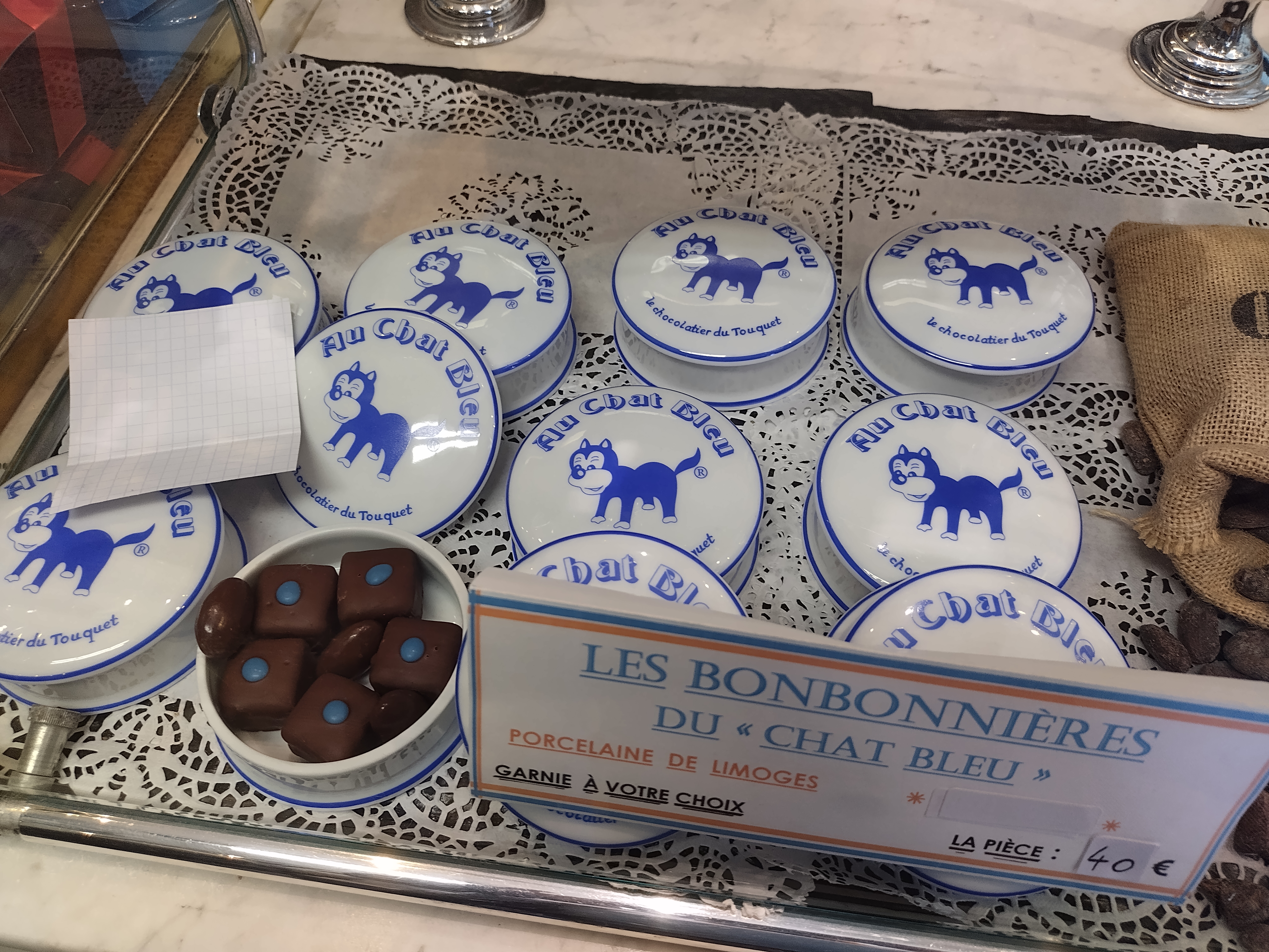 Comme à chaque passage au Touquet , une visite gourmande incontournable au chat bleu pour quelques chocolats histoire de combler les jours pluvieux. La boutique n est pas très grande et il est judicieux d établir un premier choix à travers la vitrine extérieure où une grande parties des gourmandises est exposée. L accueil fut agréable. Seuls 3 des 5 chocolats choisis nous ont apporté un peu de satisfaction, sans plus. Je ne garderai pas cette institution que je connais depuis plus de 40 ans dans mes chocolateries préférées. Un regret.